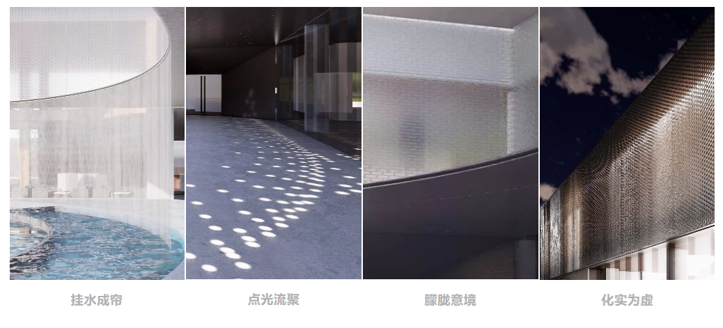 本案在設(shè)計中試圖打造一種新型的建筑形態(tài),將建筑、景觀、室內(nèi)進(jìn)行有機(jī)結(jié)合。利用玻璃磚的折射效果,重新定義絲綢的朦朧感如何刻印在靜態(tài)的建筑至上,為項目增加了一份專屬于東方的神秘感。