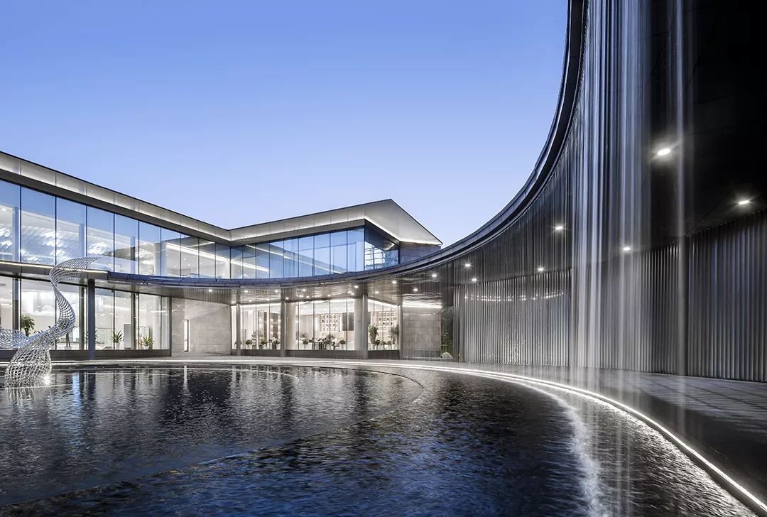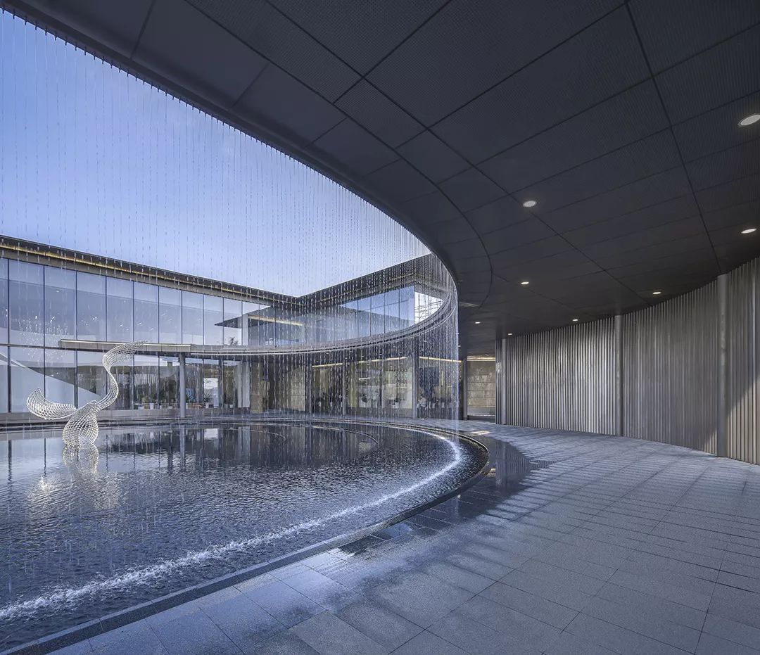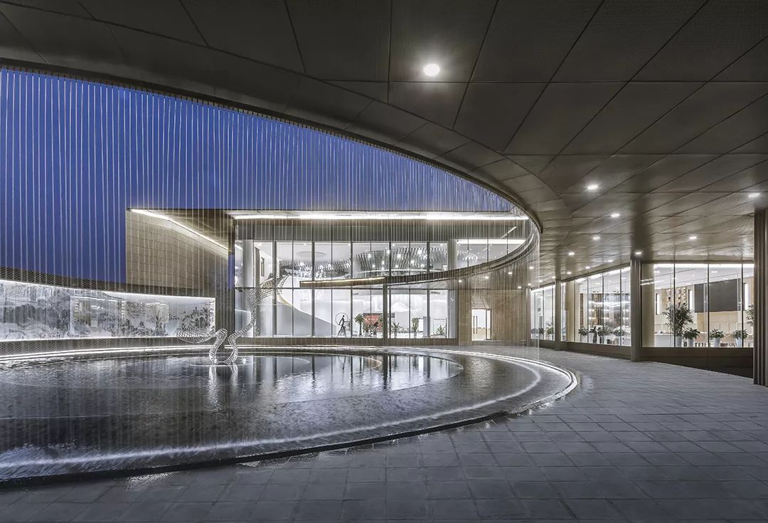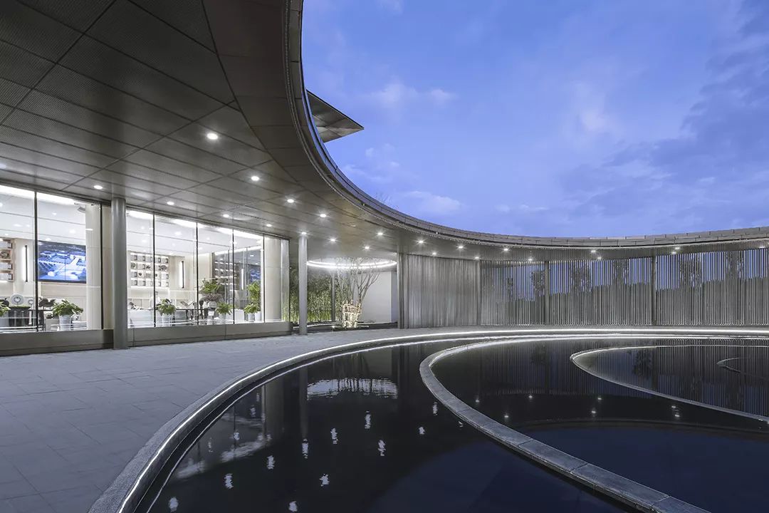 水的多變性與不穩(wěn)定性與絲綢相似,作為建筑元素更可烘托長安古城“渭水貫城,以象天漢”的古都?xì)鈩?。方正的建筑主體中“生長”出的曲線景觀廊道,拉長了參觀動線,弧形景觀通廊的手法配合水幕裝置,以動態(tài)的手法,從視覺和觸覺上模擬絲綢柔的質(zhì)感,將“絲綢”的“柔”從抽象的概念轉(zhuǎn)化為生動的建筑語言,使原本略顯局促的前場空間更具豐富的體驗,并成功將客戶引入室內(nèi)感受到更為細(xì)致的“絲綢”感受,增加儀式感。