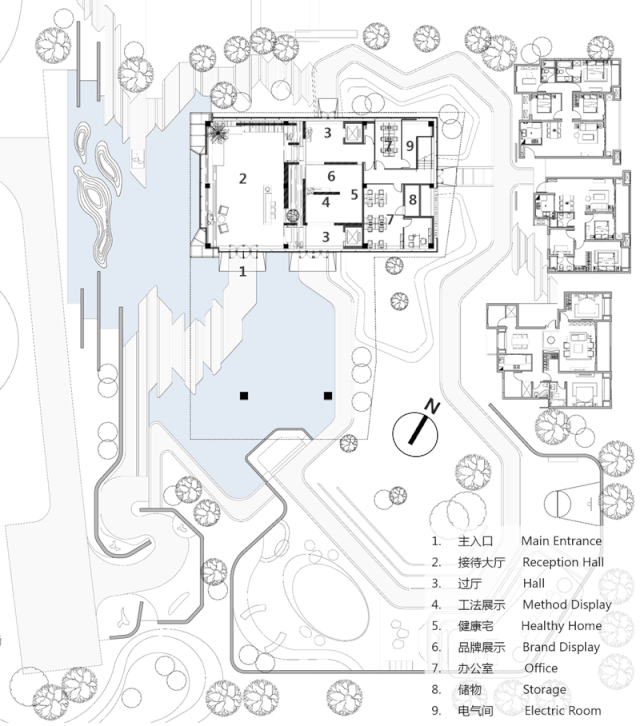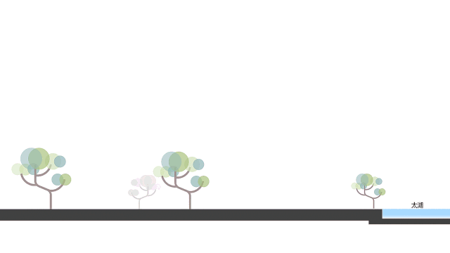 由于作為示范區(qū)的藝術(shù)中心選址與太湖駁岸之間尚有沿河綠帶及道路相隔,且沿湖濱道路的行道樹主要為高大的香樟樹,其平均高度超過6米,嚴重遮擋了建筑底層的觀景視線;為打破這個格局,設(shè)計采用了有別于常規(guī)示范區(qū)的流線組織,將展示區(qū)、洽談區(qū)等主要功能提升至三層,并設(shè)置大片通透的玻璃幕墻作為觀景外窗,打通室內(nèi)外空間上的視覺廊道,保證訪客立于窗前時,視線越過香樟樹頂,一覽太湖的水景天光。