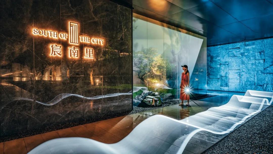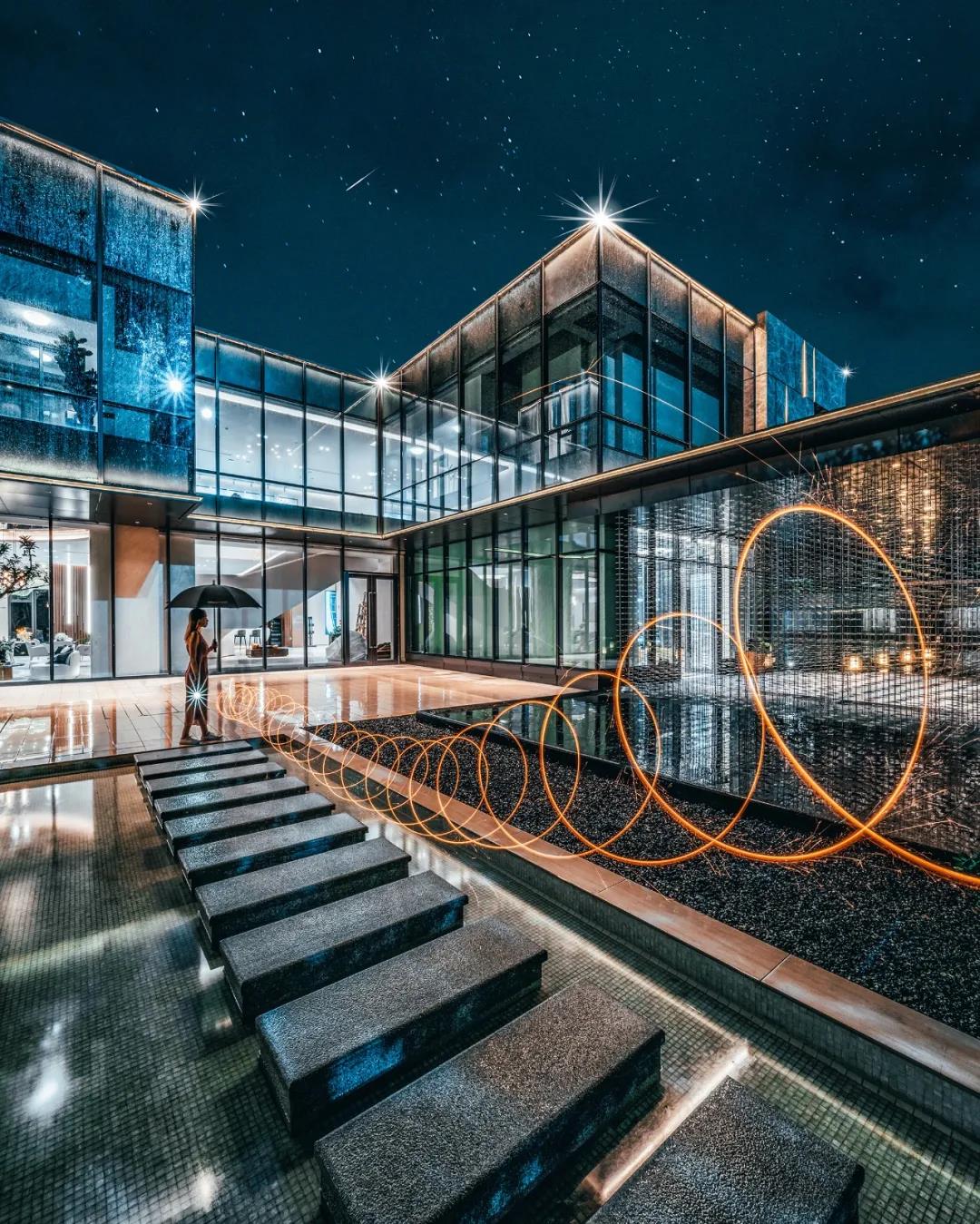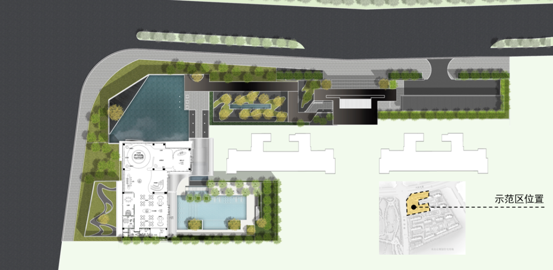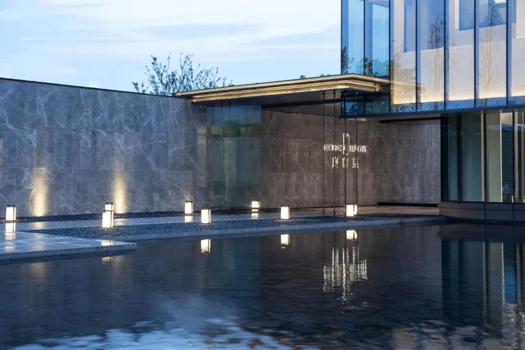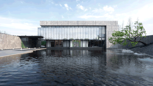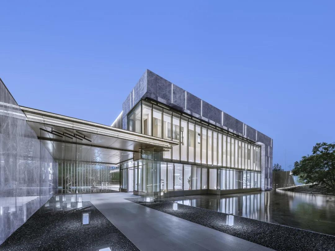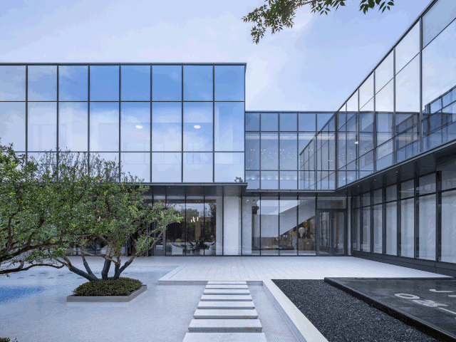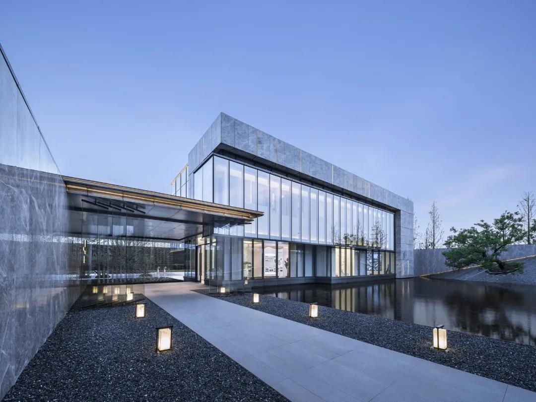 銷售中心通體方正、造型結(jié)構(gòu)極簡,以正方形體塊為基礎(chǔ),設(shè)計師按照功能要求,進行體塊的切分及穿插轉(zhuǎn)折。建筑的南側(cè)及西側(cè)為展示面,為延引更多景觀視野進入室內(nèi),故而做了加寬加長的處理,總體略呈“L”形;而在“L”形的后端,恰好為示范區(qū)后場留出較大的內(nèi)院空間,可供來賓流連欣賞。