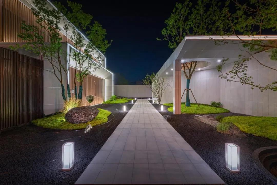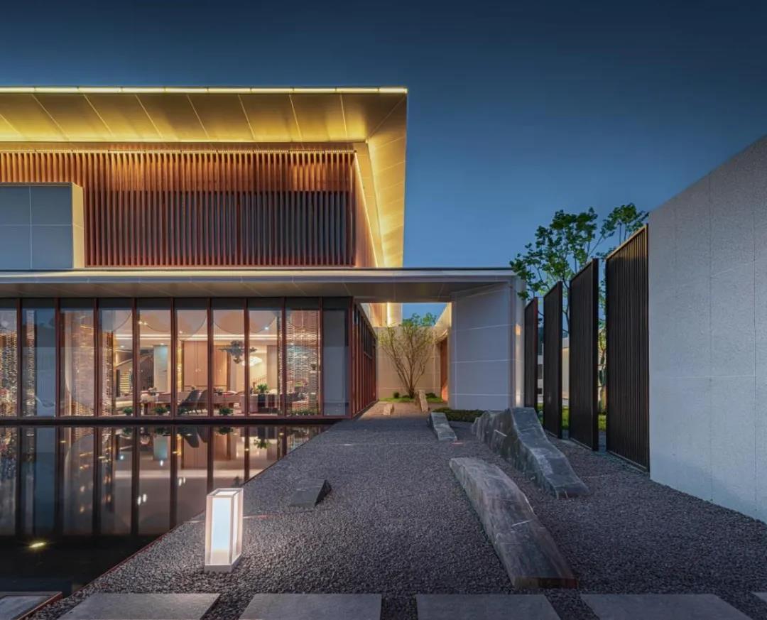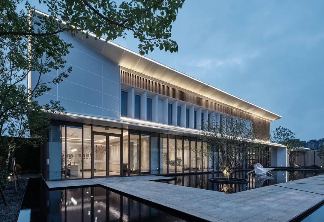 銷售中心與樓前的鏡面水池、庭樹、雕塑、步道及景墻相互映襯,空靈靜遠(yuǎn),飄逸絢麗,充滿了“地之所載,六合之間”的體驗感。