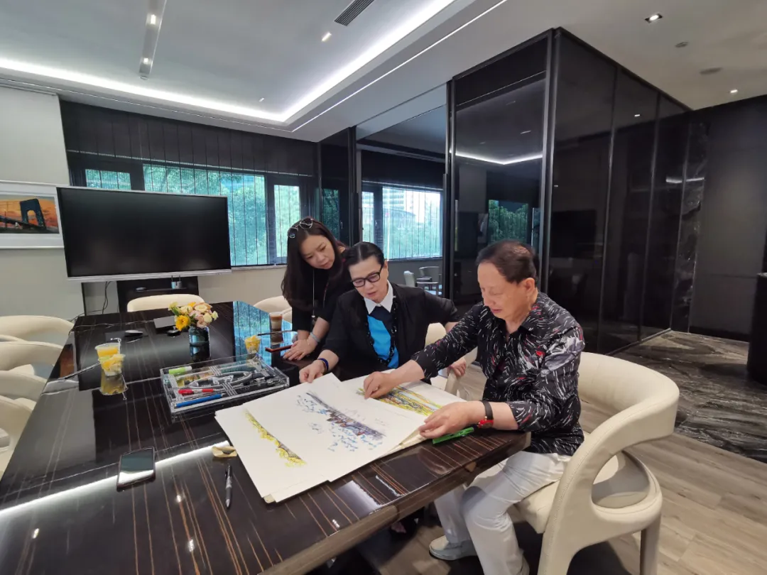 8月7日,當(dāng)代中國建筑設(shè)計大師邢同和先生蒞臨BAC竹園藝術(shù)中心,在王霞博士的陪同下,參觀了海派藝術(shù)家朱開榮、殷峻建筑暨繪畫雙個展——凝望。王霞博士將著名藝術(shù)家朱開榮的畫作《海上記憶—外灘1937》贈與邢同和先生。邢同和先生將曾贈與各國領(lǐng)導(dǎo)人的《創(chuàng)意生輝》手稿手繪草圖大作贈予方大設(shè)計。