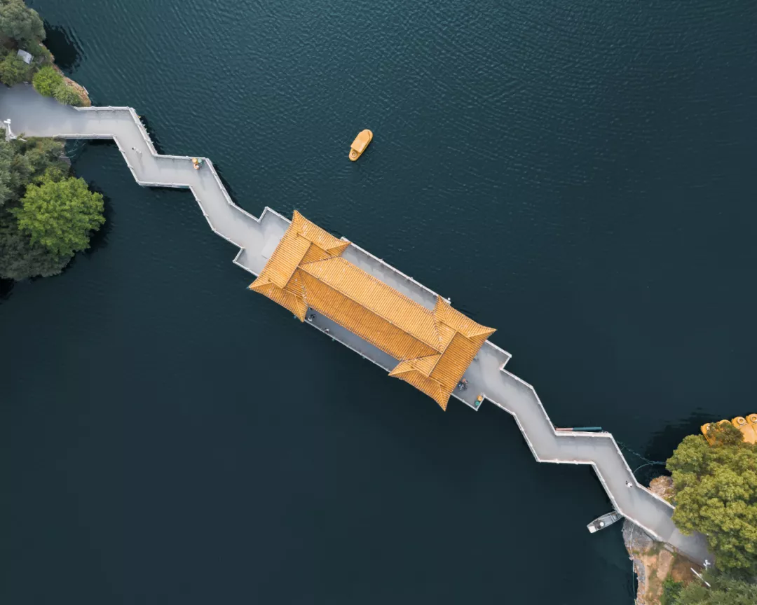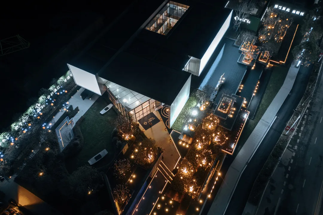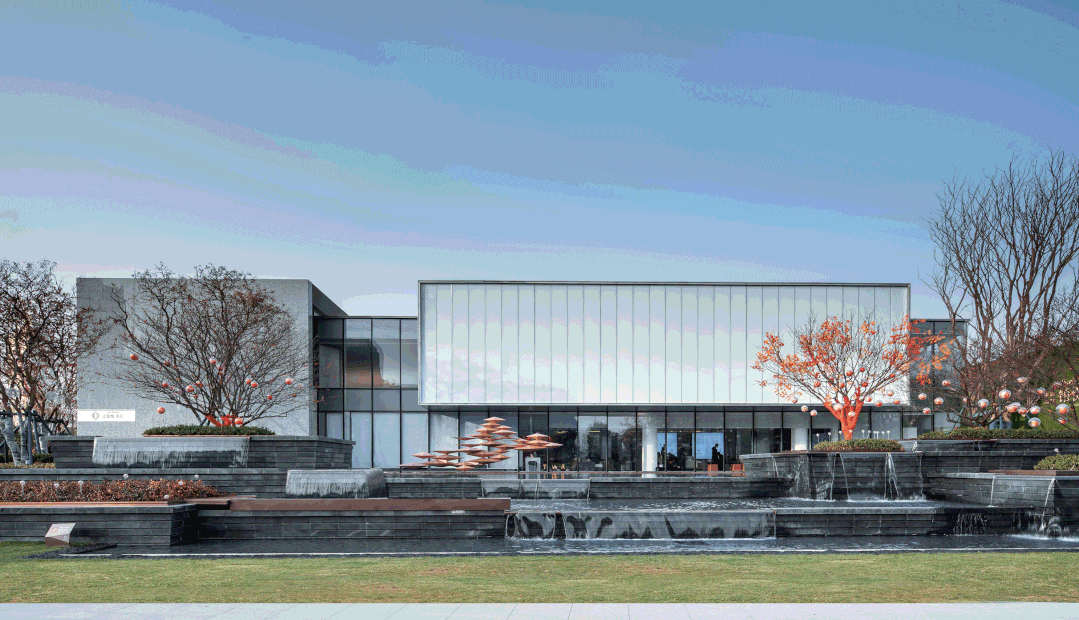示范區(qū)的景觀設(shè)計(jì),依舊沿用了簡(jiǎn)約明快的造園風(fēng)格,引入疊落的水景和鏡面水池,以折線為鋪地和曲橋形式,加入厚重的石材擋墻與輕巧的鋁板格柵區(qū)分內(nèi)外,形成山水相依的格局,隱喻長(zhǎng)江浪涌之動(dòng)及水面清幽之靜,呼應(yīng)項(xiàng)目所在地的長(zhǎng)江水文化特色。