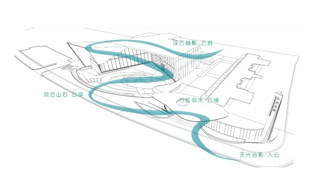 示范區(qū)景觀以參觀動線為索引,分為“入云、云境、云享、云游”四大區(qū)域,利用大尺度水景、藝術(shù)沖孔板、中央意象雕塑等精巧的細部設(shè)計,結(jié)合示范區(qū)建筑,讓整條路線充滿浸潤式體驗。