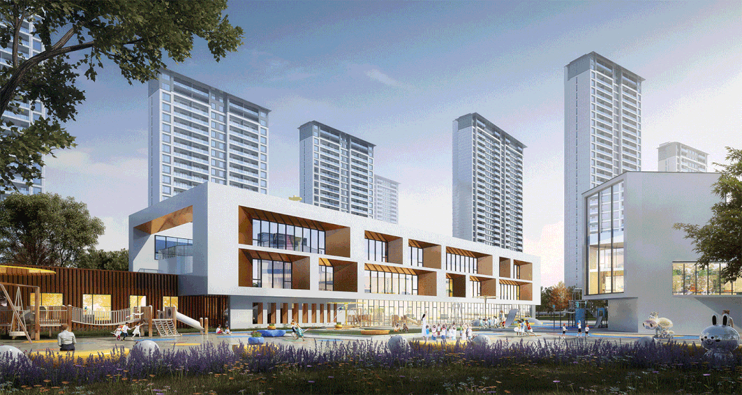漢成世家項目,配建15班規(guī)模的幼兒園。設(shè)計以“空間· 變化· 組合”為理念,充分利用地形高差,以高臺緩坡、架橋鋪路的形式,最大化利用土地資源,打造幼兒園中央大操場,并形成多重空間,帶來充滿趣味、想象力的健康兒童之家。