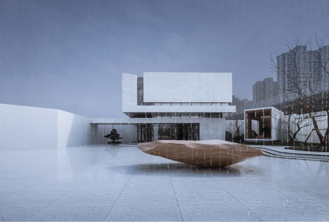 蘇州融信碧桂園·大境風(fēng)華的展示中心,是一個新中式園林中的極簡藝術(shù)館。設(shè)計師希望用最簡單直白的體塊、淺素的色彩、氤氳的光線,來表達一個沉浸在自然中的場所。建筑的造型采用了矩形作為基本的組件,采用切割、組合的方式進行破立,與材質(zhì)的虛實進行搭接后形成自身的獨特風(fēng)格。