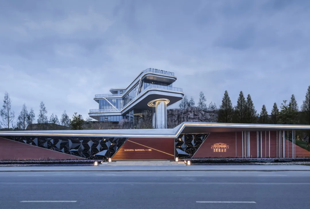 設(shè)計師以“森林秘境·未來理想國”的主題切入設(shè)計實踐,探索創(chuàng)新型立體花園生活模式,構(gòu)建會生長的理想智慧社區(qū)。示范區(qū)設(shè)計采用“遠眺群山碧水,掠影起伏”的山水理念,以折線為建筑表現(xiàn)形式,展示山川起伏、流水環(huán)繞的地域意境。造型以退界-切割-折塑-組合的建筑設(shè)計手法,呈現(xiàn)簡潔大氣、虛實相間的現(xiàn)代建筑空間。