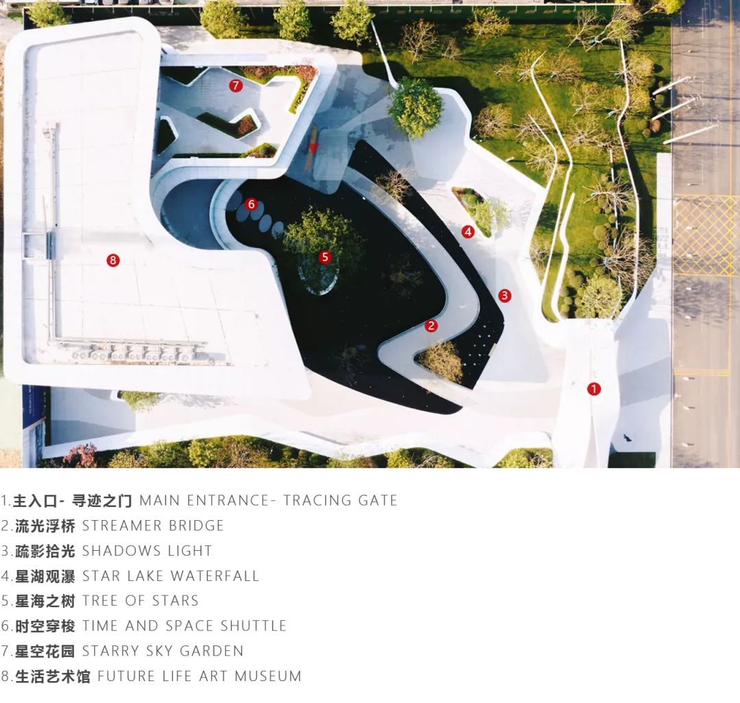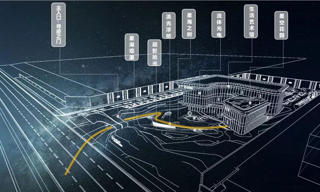 場地景觀延續(xù)建筑的設(shè)計概念,采用星空的設(shè)計語言、通過現(xiàn)代藝術(shù)手法,對概念主題的“星跡”空間元素進行抽象化,以幾何構(gòu)成的形式,表現(xiàn)星空運轉(zhuǎn)的軌跡,打造沉浸式的景觀體驗。