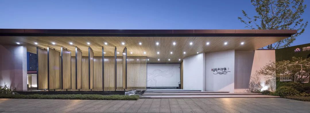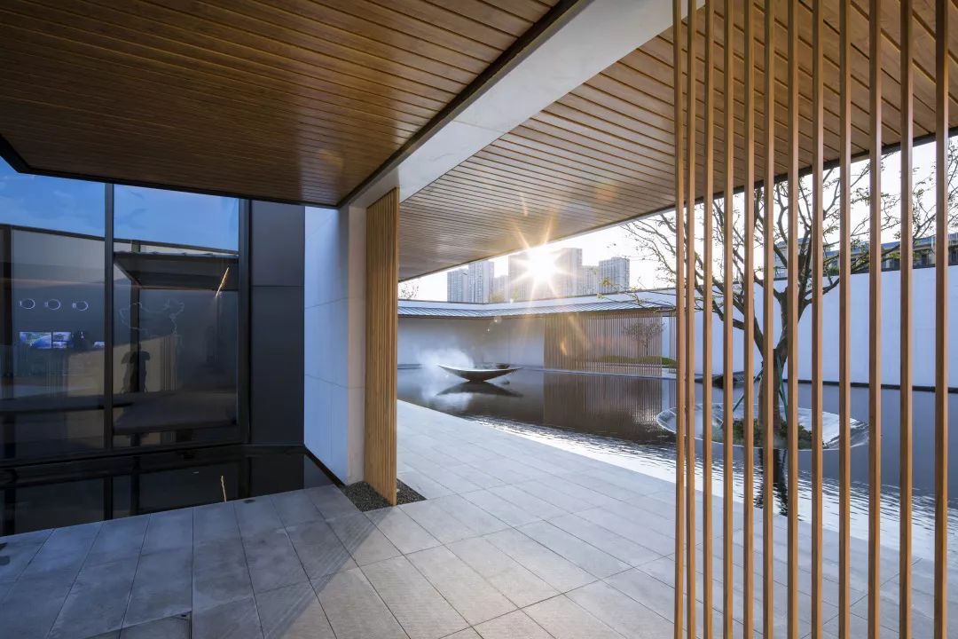 源起東甌王廟的欄桿屋架與山石基座,經(jīng)由設(shè)計(jì)師的提煉抽離,融合在本案中。出檐深遠(yuǎn)的金屬屋面,賦予了傳統(tǒng)建筑大挑檐屋面的時(shí)代意義;從山石基座中演化而成的樓層基座與首層門頭,簡(jiǎn)約大方又極具現(xiàn)代摩登感;立面橫向線條的處理手法,在強(qiáng)調(diào)造型感的同時(shí),也增加了建筑整體的輕盈感,比例均衡卻又虛實(shí)明確,營(yíng)造出充滿現(xiàn)代感的中式立面效果。