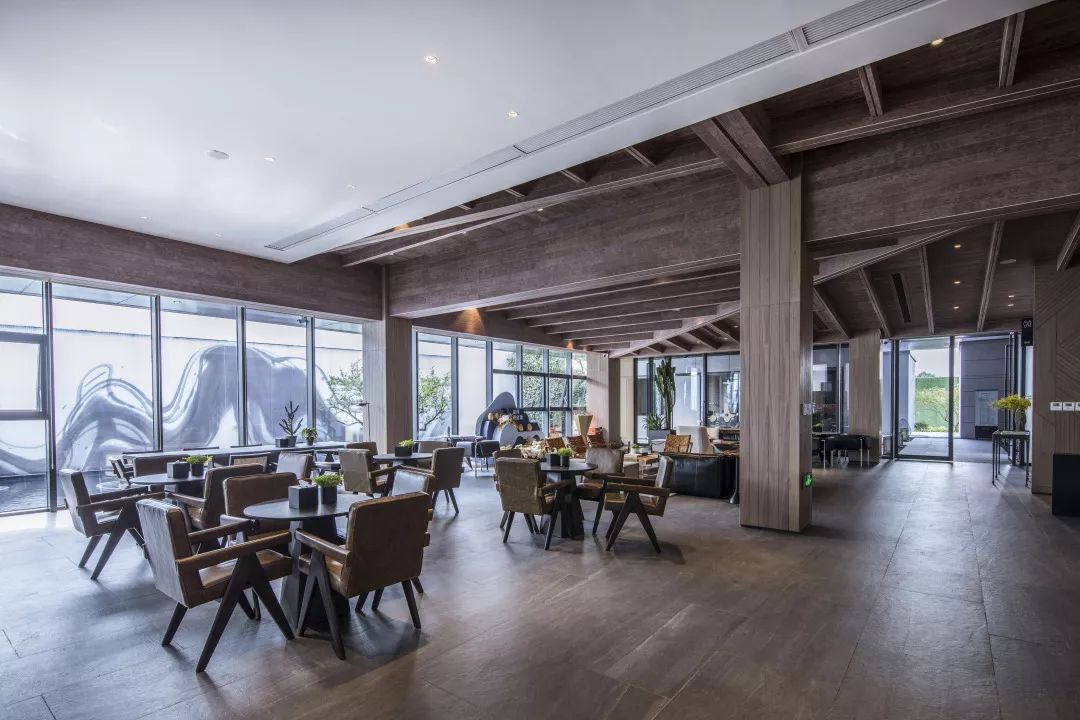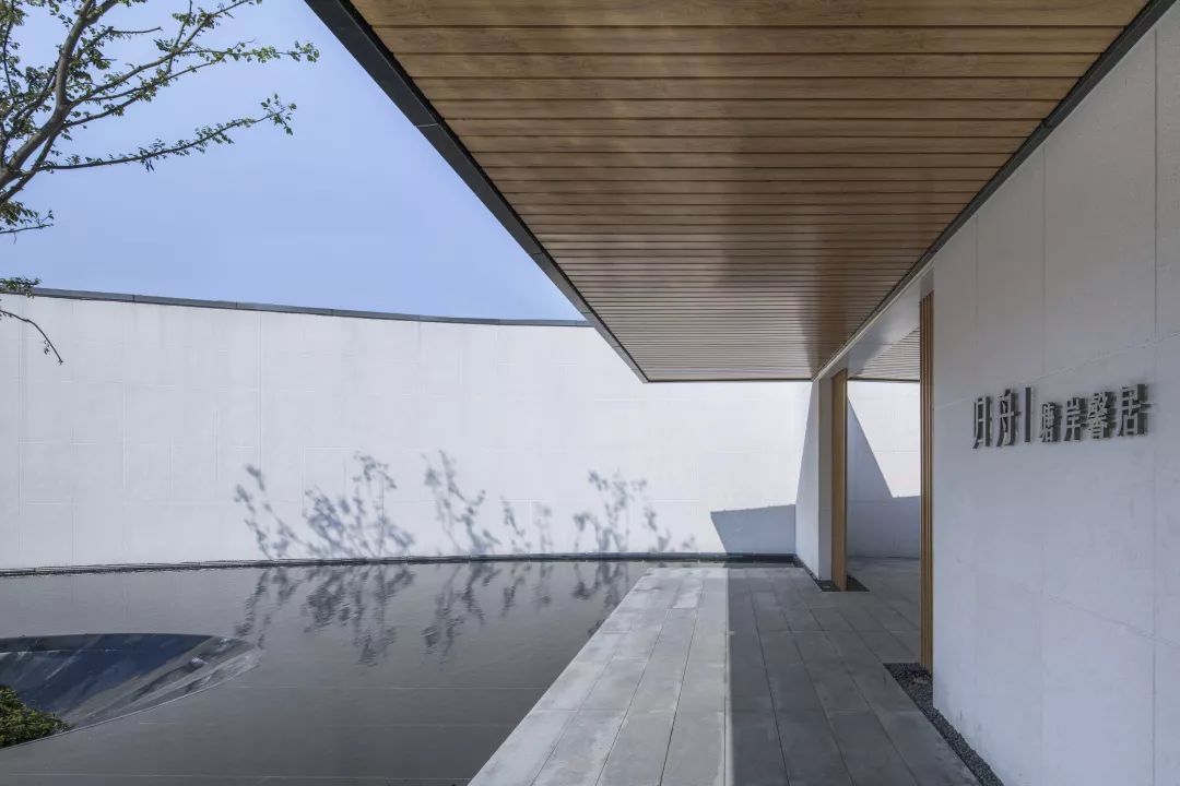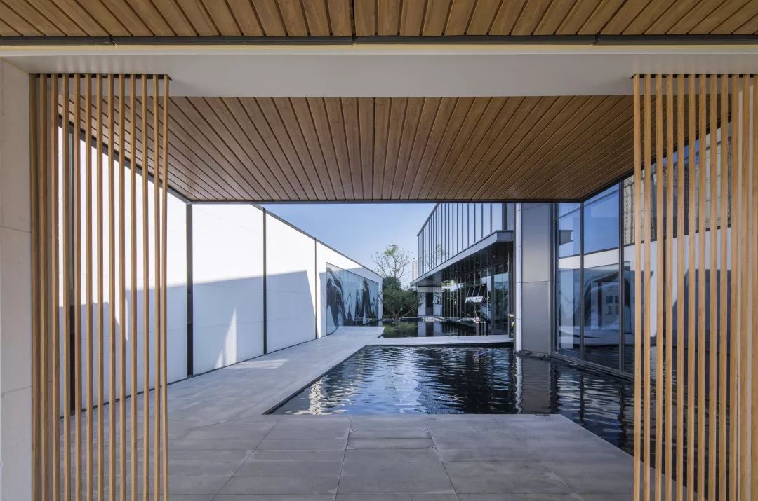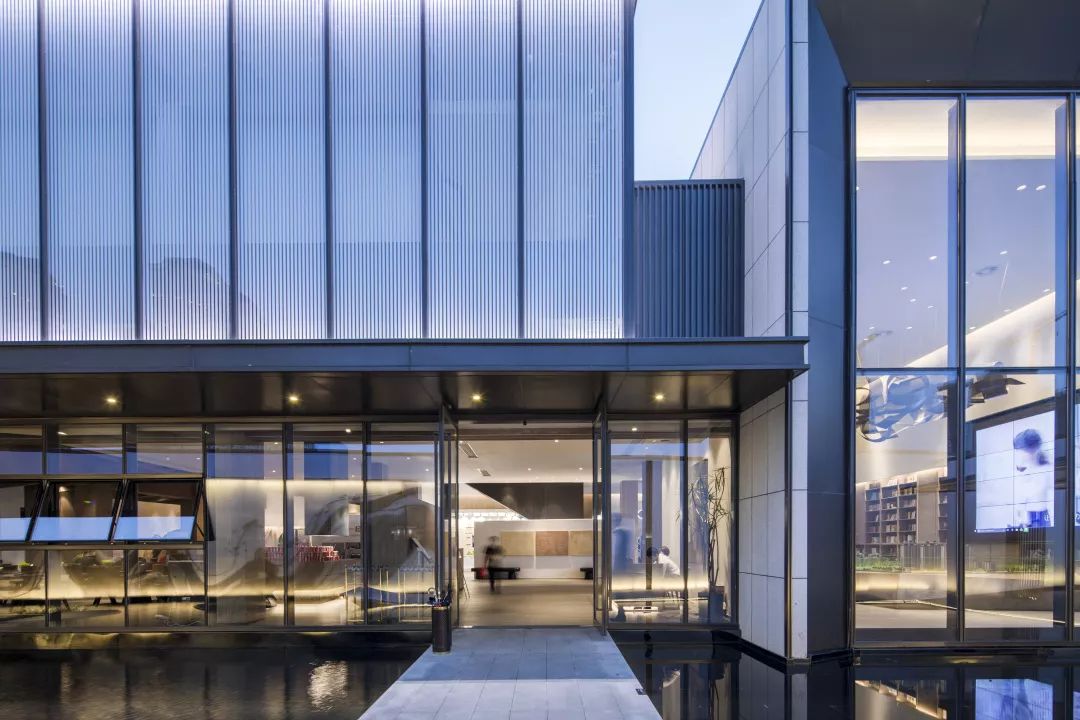 配合現(xiàn)代古典風(fēng)格的建筑主體,同時(shí)也考慮了與周邊山水自然環(huán)境之間的關(guān)系,在建筑材料的選擇上充分考慮了溫瑞塘河景觀的視覺舒適度,以炭灰色鋁板、淺灰色石材為主基調(diào),搭配炭灰色金屬漆作為點(diǎn)綴,形成層次分明的視覺焦點(diǎn)。